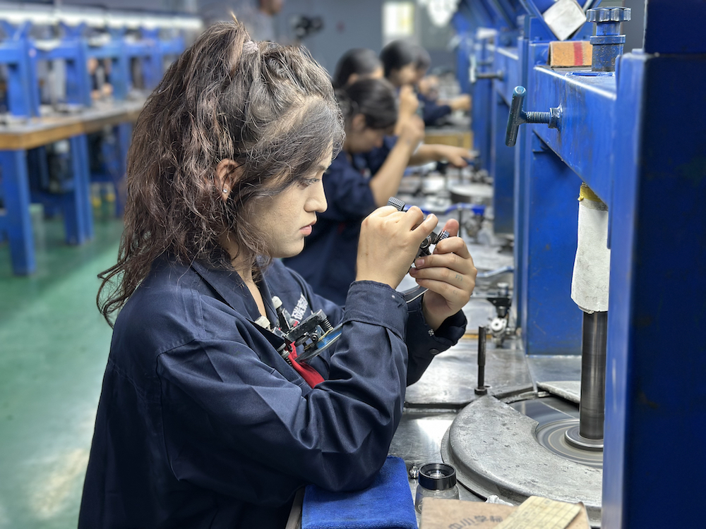 在碳索芯材的工厂车间,记者看到,诸多工人正在打磨钻石,他们排列成一直线,紧锣密鼓地进行打磨流程。据现场工作人员介绍,CVD培育钻石毛坯需要10倍放大镜初筛红外光谱仪,检测晶体完整性,切面设计方面使用三维全息投影建模,需要有58切面立体光效模拟确定最佳切割方案,精密切割时金刚石微粉砂轮预成型,工人需要多向分层渐进打磨表面粗糙度,以呈现基础火彩。这是一项具有技术难点的工作。