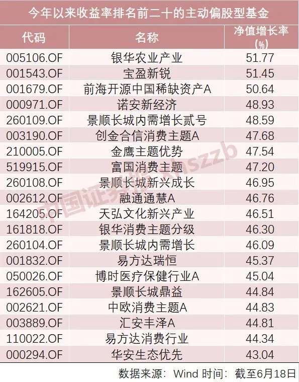 截至6月18日,数据显示,偏股型基金中银华农业产业以51.77%的净值增长率居于榜首,宝盈新锐和前海开源中国稀缺资产紧随其后,净值增长率分别为51.45%和50.64%。