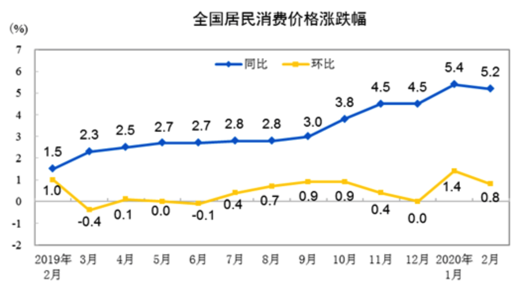 2020年2月份CPI同比上涨5.2%,食品价格上涨较多