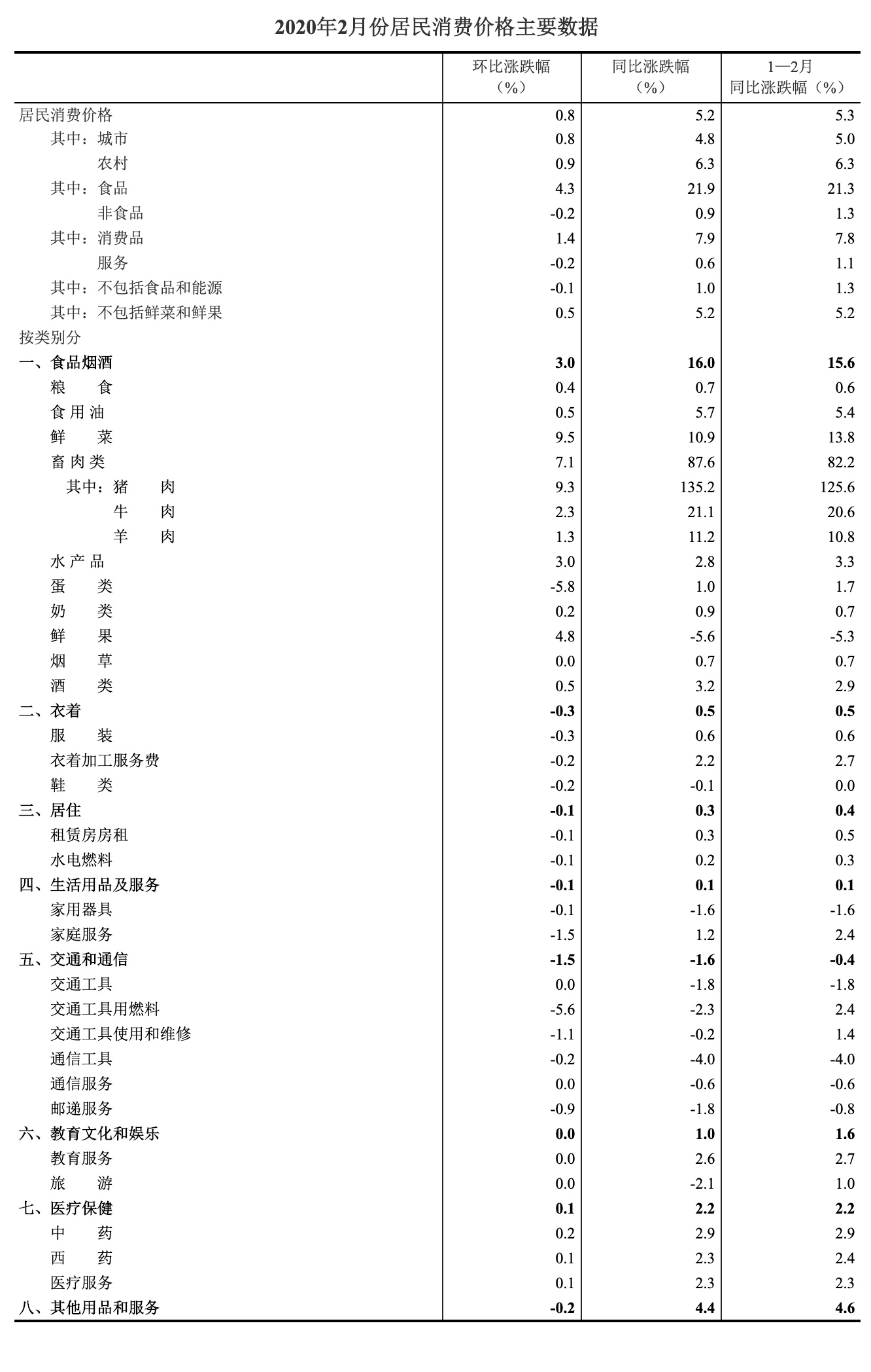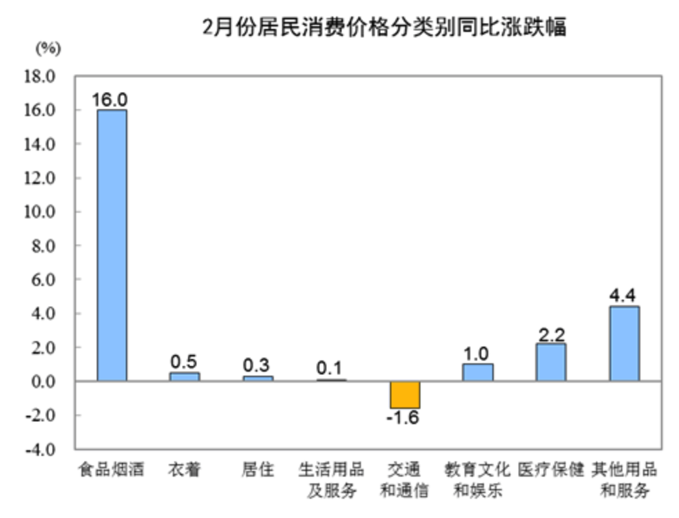 2月份,食品烟酒类价格同比上涨16.0%,影响CPI(居民消费价格指数)上涨约4.84个百分点。食品中,畜肉类价格上涨87.6%,影响CPI上涨约3.85个百分点,其中猪肉价格上涨135.2%,影响CPI上涨约3.19个百分点;鲜菜价格上涨10.9%,影响CPI上涨约0.33个百分点;水产品价格上涨2.8%,影响CPI上涨约0.05个百分点;蛋类价格上涨1.0%,影响CPI上涨约0.01个百分点;粮食价格上涨0.7%,影响CPI上涨约0.01个百分点;鲜果价格下降5.6%,影响CPI下降约0.11个百分点。