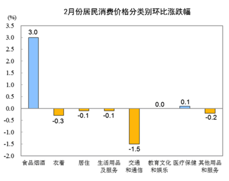 2月份,食品烟酒类价格环比上涨3.0%,影响CPI上涨约0.99个百分点。食品中,鲜菜价格上涨9.5%,影响CPI上涨约0.28个百分点;畜肉类价格上涨7.1%,影响CPI上涨约0.53个百分点,其中猪肉价格上涨9.3%,影响CPI上涨约0.45个百分点;鲜果价格上涨4.8%,影响CPI上涨约0.08个百分点;水产品价格上涨3.0%,影响CPI上涨约0.05个百分点;蛋类价格下降5.8%,影响CPI下降约0.04个百分点。