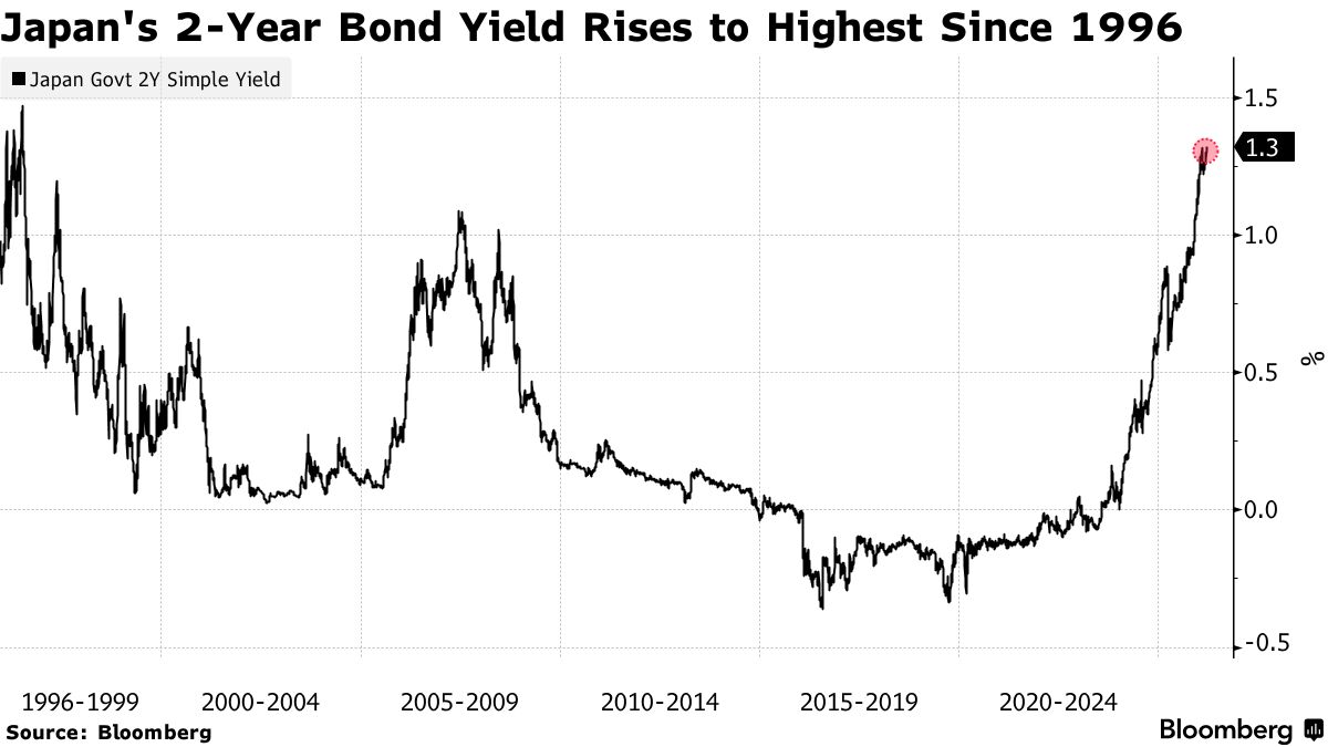 随着市场对日本央行近期加息的预期升温,日本两年期国债收益率攀升至1996年以来最高水平,五年期国债收益率则创下历史新高。数据显示,对货币政策预期敏感的两年期国债收益率周四上涨1.5个基点至1.32%,超过了上月触及的1.31%的前期高点;五年期国债收益率一度上涨2.5个基点至1.74%,为2000年该期限债券推出以来的最高水平。
