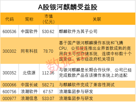 证券时报·数据宝梳理发现,A股部分上市公司与麒麟软件有股权或业务合作关系。