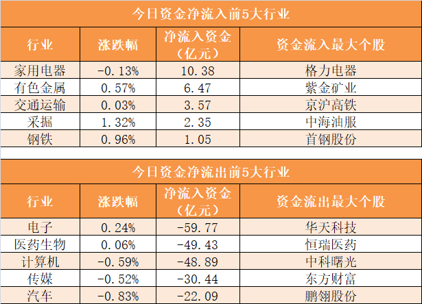 28个申万一级行业中,6个行业实现资金净流入,其中家用电器行业净流入10.38亿元居首。