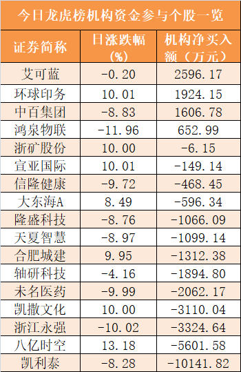 盘后龙虎榜数据显示,机构现身17股,其中艾可蓝等4股呈现机构资金净买入,凯利泰等13股呈现机构资金净卖出。