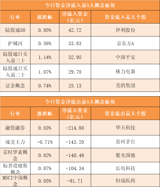 概念板块方面,今日陆股通50、护城河、陆股通日买入前二十等概念板块资金呈现净流入,其中陆股通50概念净流入42.72亿元居首。
