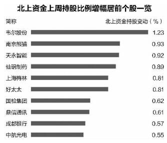 整体来看,上周北上资金增仓股数量超500只,共计545只。其中增仓超0.5个百分点的个股达到15只,而增超1个百分点以上的有1只。具体来看,韦尔股份上周获显著加仓,最新持股比例1.47%,环比增仓1.23个百分点;韦尔股份主营半导体分立器和电源管理IC等半导体的研发设计业务,在5G领域有相关应用,该公司上周股价逆势上涨1.2%。