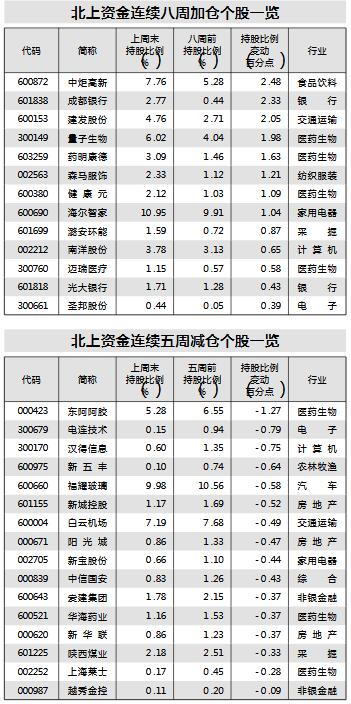数据宝统计显示,6月14日以来,北上资金连续四周买入119股。分行业来看,医药生物、食品饮料、机械设备股数量居多,均超过7只。