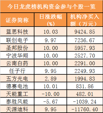 盘后龙虎榜数据显示,机构现身11股,其中蓝思科技等9股呈现机构资金净买入,天源迪科等2股呈现机构资金净卖出。