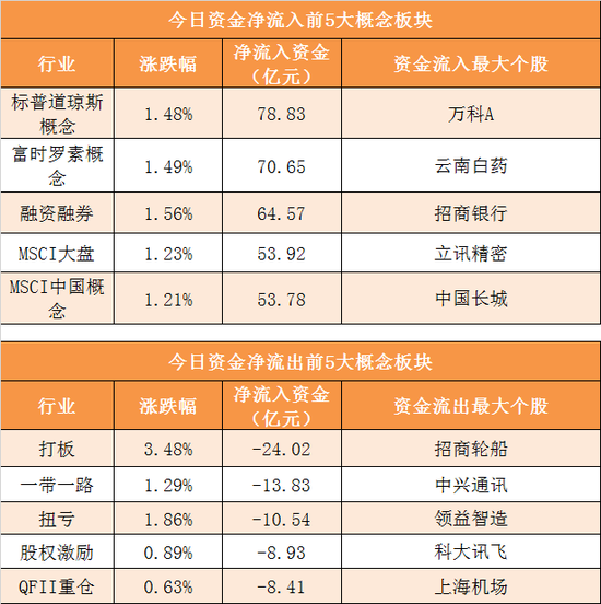 概念板块方面,今日标普道琼斯概念、富时罗素概念、融资融券、MSCI大盘等概念板块资金呈现净流入,其中标普道琼斯概念净流入78.83亿元居首。