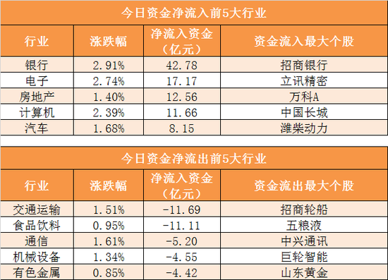 28个申万一级行业中,16个行业实现资金净流入,其中银行业净流入42.78亿元居首。