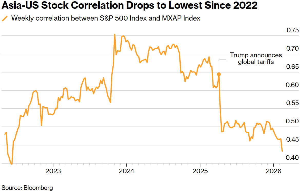 数据显示,亚洲和美国股市基于周收益率的相关性已降至0.43,为2022年6月以来的最低水平。