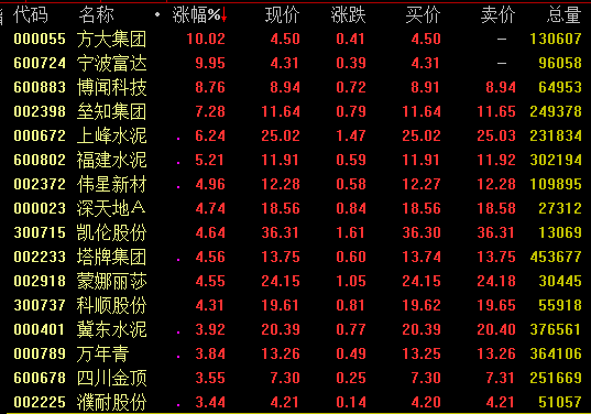 建材板块20日盘中震荡走高,截至发稿,方大集团、宁波富达涨停,博闻科技涨近9%,垒知集团涨逾7%,上峰水泥、福建水泥等涨幅超5%。
