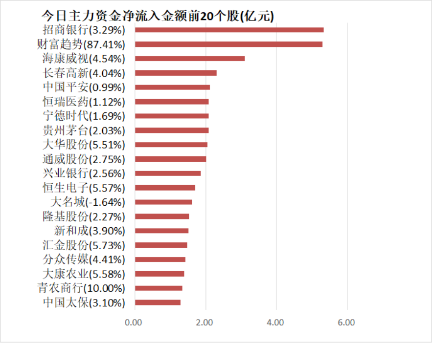 沪深300今日主力资金净流入2.23亿元,创业板净流出32.75亿元,中小板净流出47.55亿元。沪股通净流入25.29亿元,深股通净流入28.63亿元(本文中沪股通、深股通净流入额以当日已用额度来计,与成交净买入额略有差异,但表示的意义大体一致)。