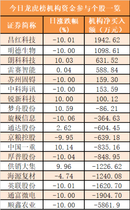 盘后龙虎榜数据显示,机构现身18股,其中昌红科技等7只股票呈现机构资金净买入,顺鑫农业等11股呈现机构资金净卖出。
