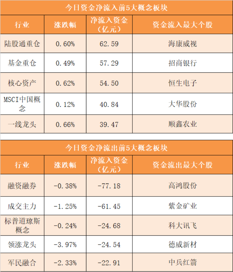 概念板块方面,今日陆股通重仓、基金重仓、核心资产、MSCI中国概念等概念板块资金呈现净流入,其中陆股通重仓概念净流入62.59亿元居首。