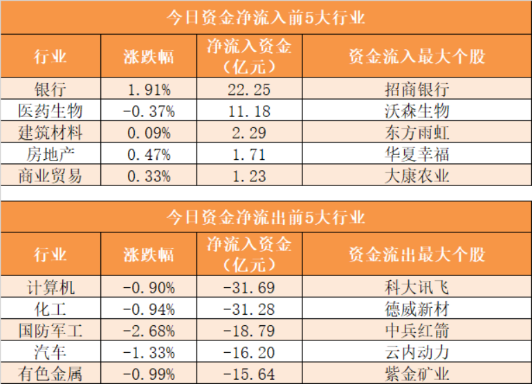 28个申万一级行业中,6个行业实现资金净流入,其中银行业净流入22.25亿元居首。