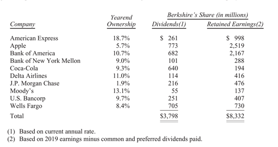 以下,我们将列出我们通过股市投资的10支最重要成份股,具体条目包括我们持股占其全部股票的比例、我们所获得的股息(基于当前年收益率、单位100万美元),以及他们的盈利保留情况(2019年盈利减去已经派发的普通股和优先股股息、单位100万美元)。