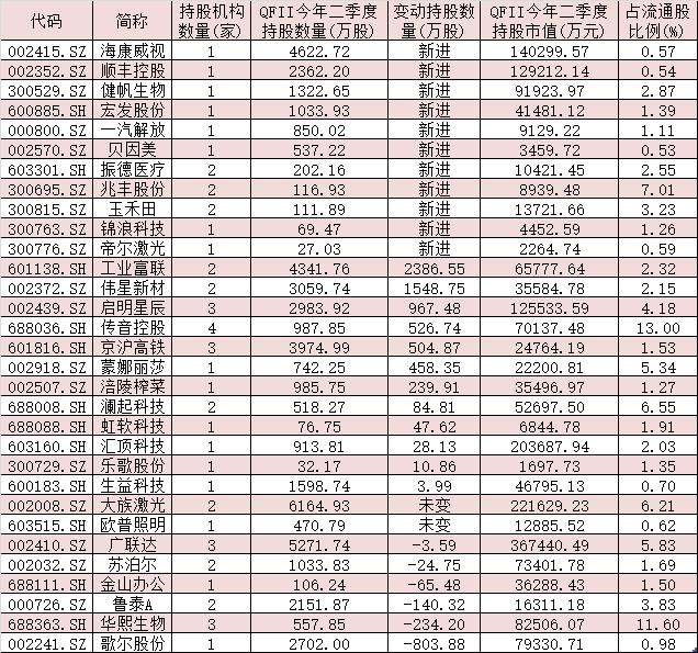 值得一提的是,以QFII为代表的外资已提前布局海外机构调研品种。统计显示,上述139只个股中,截至今年二季度末,有31只个股被QFII持仓,合计持股市值达203.63亿元。其中,有23只个股成为今年二季度QFII新进增持的重点品种,QFII新进持有海康威视、顺丰控股(002352)、健帆生物(300529)、宏发股份、一汽解放(000800)、贝因美(002570)、振德医疗、兆丰股份(300695)、玉禾田(300815)、锦浪科技(300763)、帝尔激光等11只个股,QFII并对包括工业富联、伟星新材(002372)、启明星辰(002439)、传音控股、京沪高铁(601816)等在内的12只个股进行了继续加仓操作,后市表现值得关注。