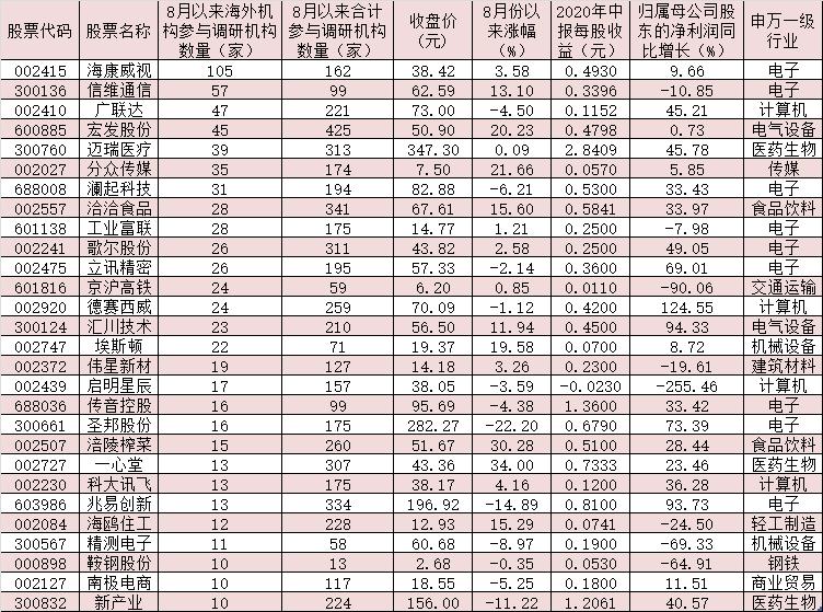 速看!海外机构8月份以来积极调研139家公司