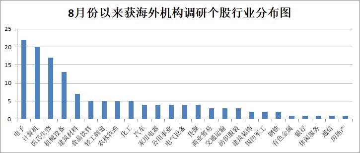《证券日报》记者根据同花顺(300033)数据统计发现,8月份以来,沪深两市共有139家上市公司获得海外机构密集走访调研,这些公司主要扎堆在电子、计算机、医药生物、机械设备等四行业,涉及公司数量分别为22家、20家、17家、13家。