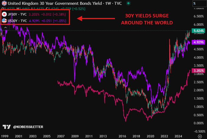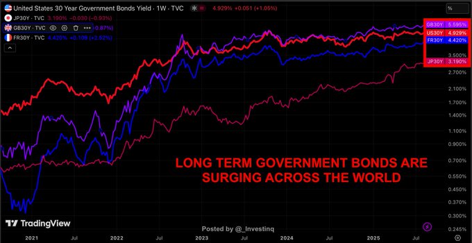 但自2023年以来,情况却截然相反:各国央行保持稳定或发出降息信号,而长期债券收益率却飙升至了数十年来的最高水平。