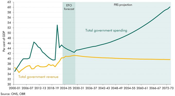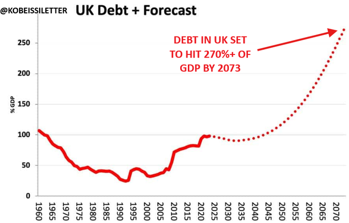 其结果是,英国即将面临巨额的国家债务——到2073年,英国的债务将达到GDP的274%。这意味着赤字将达到GDP的21%。仅这笔债务的利息就相当于GDP的约13%。这堪称是一场彻头彻尾的财政崩溃。