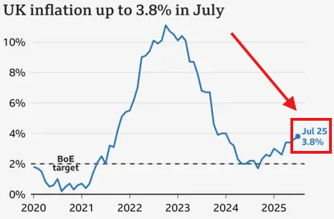 与此同时,眼下英国的通货膨胀也正再次抬头,并且急剧上升。英国7月份CPI同比涨幅达到了3.8%,预计8月份通胀率将达到4%以上。这将使得通胀率达到英国央行目标水平的两倍。
