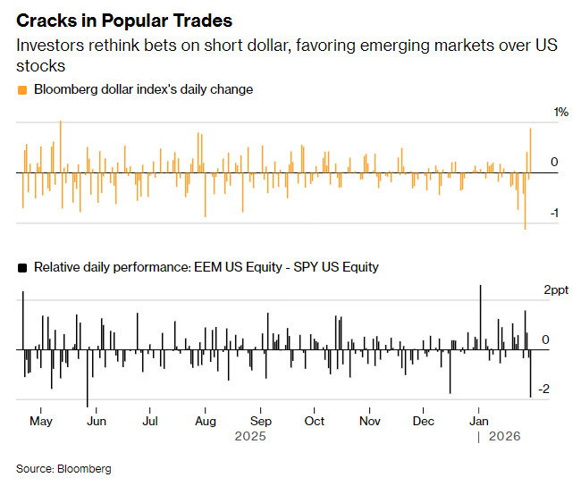 周五,美元指数创下5月以来的最大单日涨幅,重创美元空头;新兴市场股市相对美股的表现,也录得5月以来的最差单日表现。市场裂痕其实在周四早盘已现端倪——金银价格在30分钟内暴跌超7%后虽有所反弹,但颓势已定。