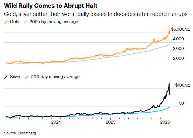 在正常的市场环境下,上述因素叠加或许只会引发温和回调。但如今的市场,投资者持仓方向高度趋同,杠杆水平也在暗中不断累积——仅这些因素,就足以触发单日大幅下跌:黄金重挫逾9%,白银暴跌约27%。