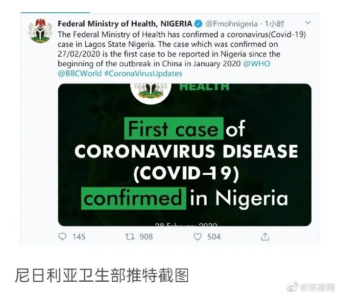 尼日利亚卫生部28日在其推特上宣布,该国出现首例新冠肺炎确诊病例。