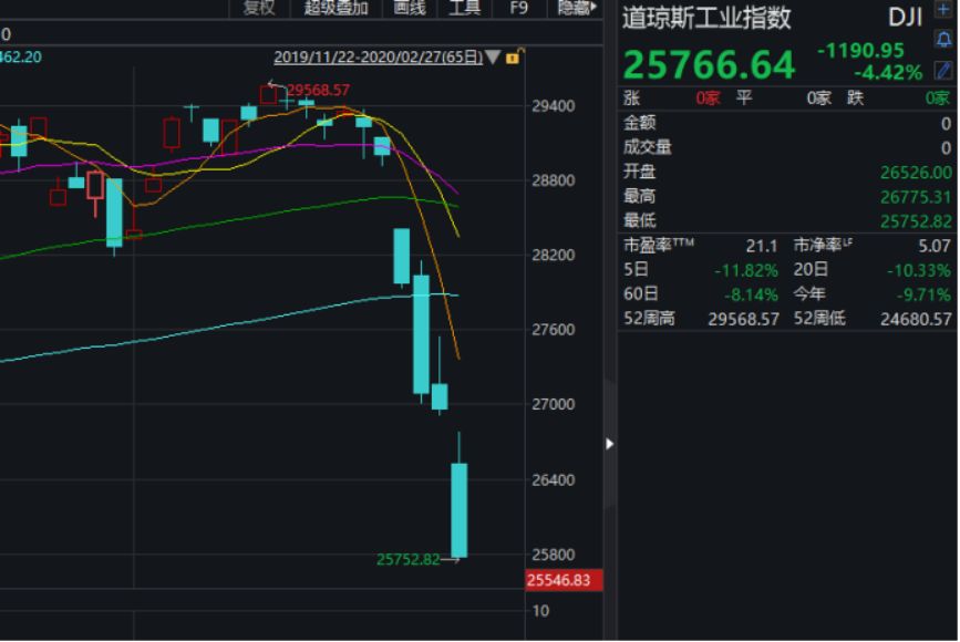 具体来看,在此前连续下跌后,美东时间周四,道指再次遭遇深幅下跌,截至当天收盘,道指跌1190.95点,跌幅高达4.42%。