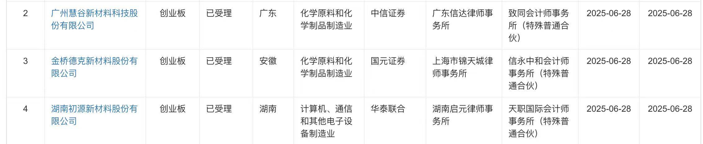 6月28日,深交所披露,广州慧谷新材料科技股份有限公司(慧谷新材)、金桥德克新材料股份有限公司(金桥德克)、湖南初源新材料股份有限公司(初源新材)深交所创业板IPO申请已获受理。