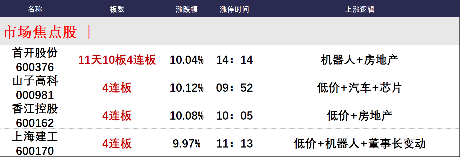 个股方面,华建集团断板,市场连板高度维持在4连板,上海建工、山子高科、首开股份、香江控股均晋级4连板,值得注意的是这4只股票均为低价股,其中首开股份无惧停牌核查风险,走出11天10板,奠定了较为积极的短线氛围。