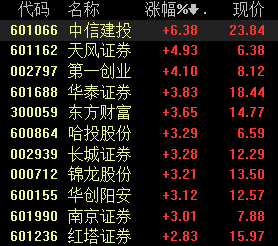 周五早盘,券商股开盘表现强势,截至发稿,板块全线飘红,中信建投涨超6%,天风证券、第一创业涨超4%,华泰证券、东方财富、哈投股份、长城证券等走强。