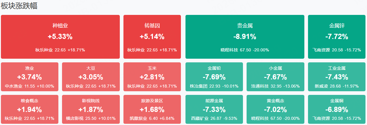 板块方面,农业、影视院线、算力产业链等板块表现活跃,贵金属、有色金属、化工等板块表现落后。截至收盘,沪指跌1.19%,深成指跌0.96%,创业板指涨0.80%。