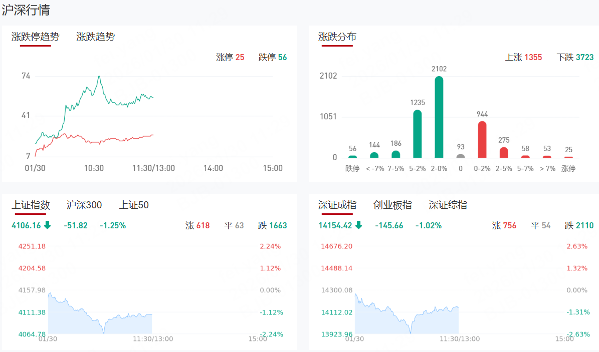 三大指数涨跌不一,沪指4100点失而复得,创业板指探底回升上演“深V”,此前一度跌超1%。沪深两市半日成交额1.93万亿,较上个交易日缩量836亿。盘面上热点快速轮动,全市场超3800只个股下跌。从板块来看,算力硬件概念逆势爆发,天孚通信涨超10%、长飞光纤涨停,均创历史新高。AI应用端盘中拉升,电声股份20cm涨停,引力传媒涨停。影视板块表现活跃,横店影视2连板。农业概念反复活跃,农发种业3天2板。下跌方面,有色金属板块集体大跌,贵金属方向领跌,晓程科技、赤峰黄金等多股跌停。锂矿概念大跌,金圆股份跌停。