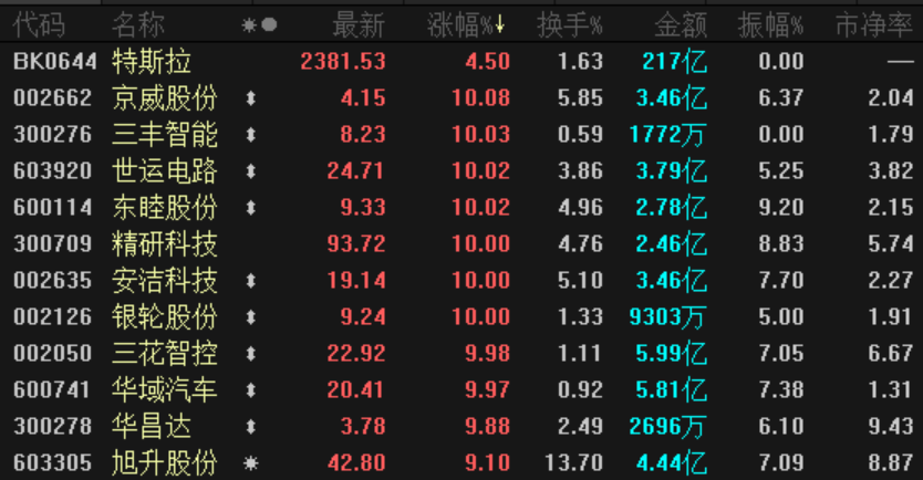 作为新能源汽车的领军者,特斯拉扭亏为盈,对整个行业的信心有极大的提振作用。今日早盘,A股特斯拉概念板块整体放量高开高走,截至午间收盘,板块指数大涨4.13%,创近3个月来最大涨幅,半日成交接近昨日全天成交。飞龙股份、京威股份、东睦股份、世运电路等9股涨停,中科电气、旭升股份、璞泰来等涨幅居前。