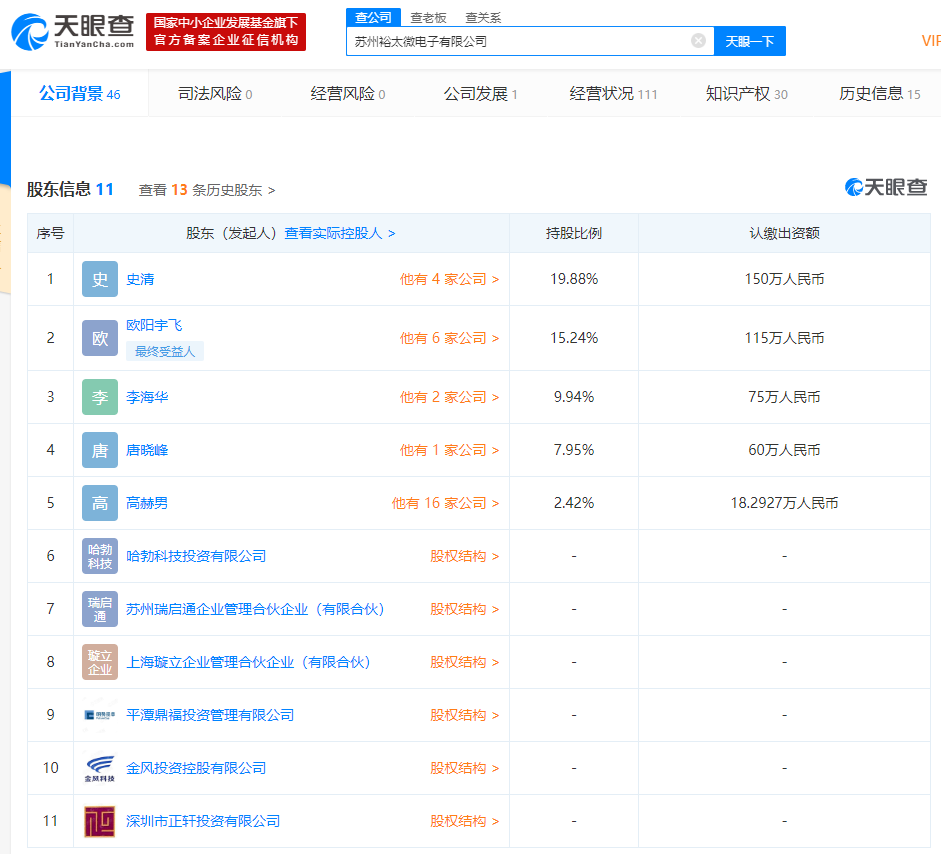 苏州裕太微电子有限公司(以下简称“苏州裕太”)曾用名苏州裕太车通电子科技有限公司,哈勃投资为其第六大股东。公司变更记录显示,2019年10月28日,苏州裕太微电子有限公司新增注册资本57.69万元,新增股东之一即哈勃投资。