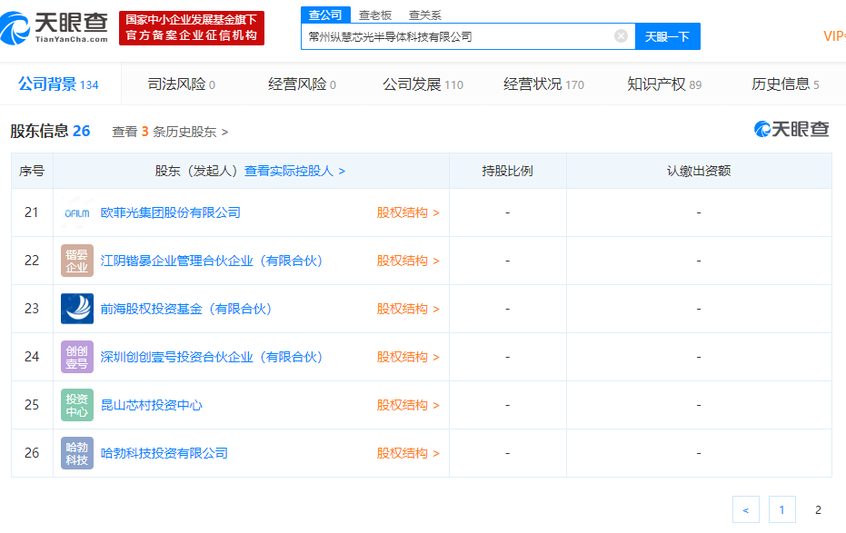 天眼查显示,6月9日,纵慧芯光进行了投资人及注册资本变更,公司注册资本由2000万元变更为2117.33万元,新增股东哈勃投资。纵慧芯光现有股东26名。