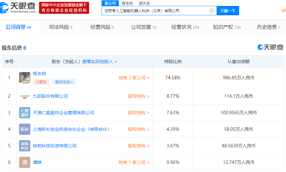天眼查的股东榜及变更记录显示,2016年7月13日,深思考新增股东九阳股份。目前,九阳股份直接持有公司8.77%股份,为公司第二大股东。