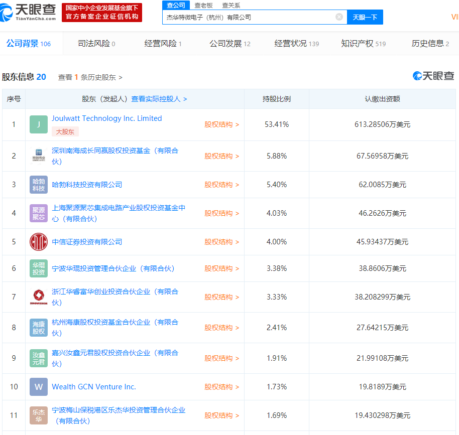天眼查显示,2019年7月11日,哈勃投资成为杰华特微电子(杭州)有限公司(以下简称“杰华特”)的新增股东。目前,哈勃投资是公司第三大股东,持股5.4%。