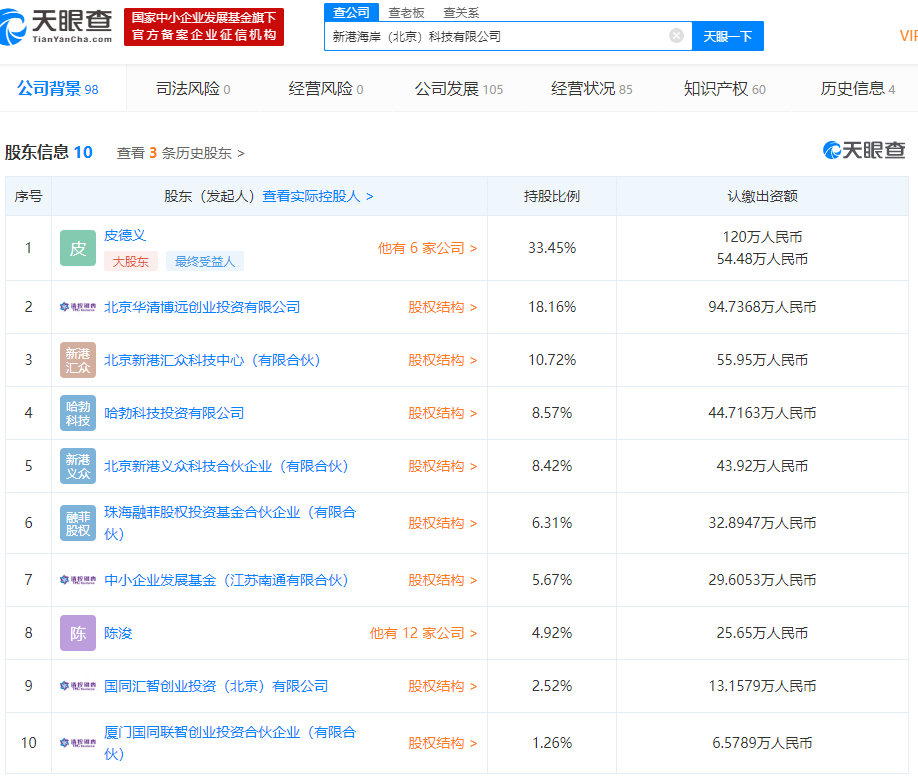 天眼查的变更记录显示,2020年4月1日,新港海岸(北京)科技有限公司(以下简称“新港海岸”)新增注册资本44.72万元,哈勃投资成为新增股东。目前,哈勃投资为公司第四大股东,持股8.57%。