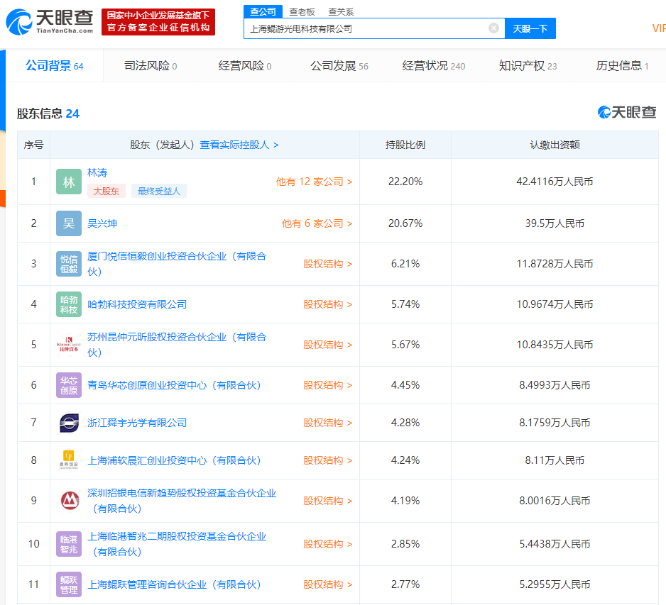 天眼查显示,2019年12月18日,上海鲲游光电科技有限公司(以下简称“鲲游光电”)变更股东,新增哈勃投资、上海临港智兆二期股权投资基金合伙企业(有限合伙)等股东。目前,哈勃投资是鲲游光电第四大股东,持股5.74%。