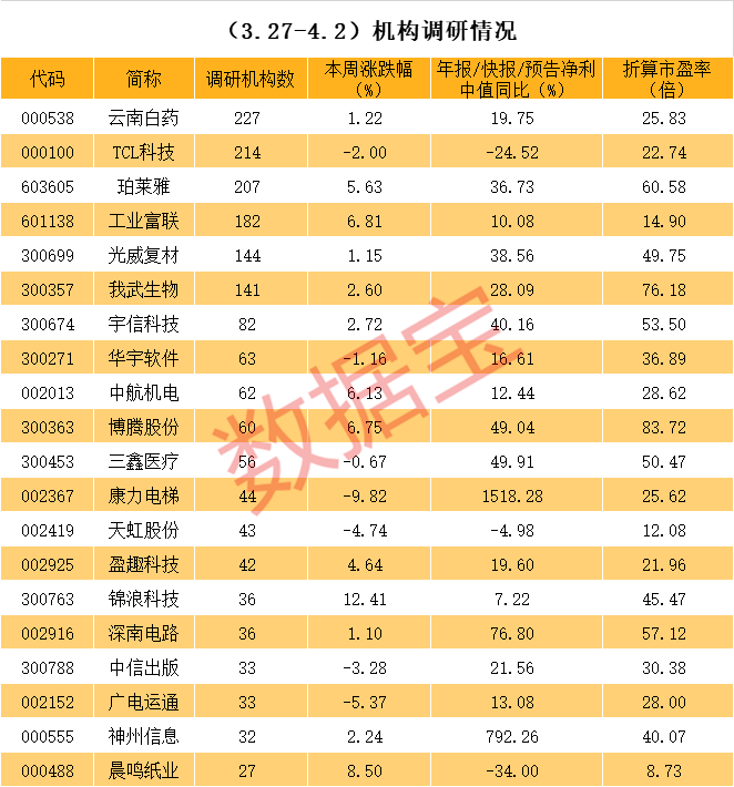 云南白药成为近一周调研机构数量最多的股票。数据显示,合计有227家机构调研了该公司,包括51家基金公司、21家证券公司、40家私募等。