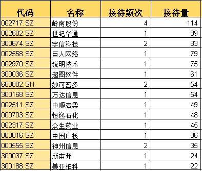 数据显示,岭南股份累计接待机构达111家,位居首位,世纪华通累计接待94家机构,排名第二,宇信科技累计接待82家机构,排名第三。(具体调研内容可登录行情软件在公告栏查看)