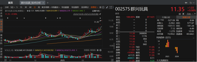 主营业务为酒类销售业务、自有物业租赁、物业管理及创业园区运营服务业务的群兴玩具2月1日迄今股价累计最大涨幅近70%。群兴玩具2月26日公告,公司与天宽科技股东签署了《股权收购框架协议》,拟以现金方式收购天宽科技不低于51%的股权。交易完成后,天宽科技将成为公司控股子公司。本次交易预计构成重大资产重组,但不构成关联交易。天宽科技官网显示,公司可为客户提供AI算力、数智安全、数字化服务等一系列产品及解决方案。2024年度,天宽科技营业收入在计算中心建设和运营领域、数字化服务领域及数智安全领域中占比约为58%、27%和15%。