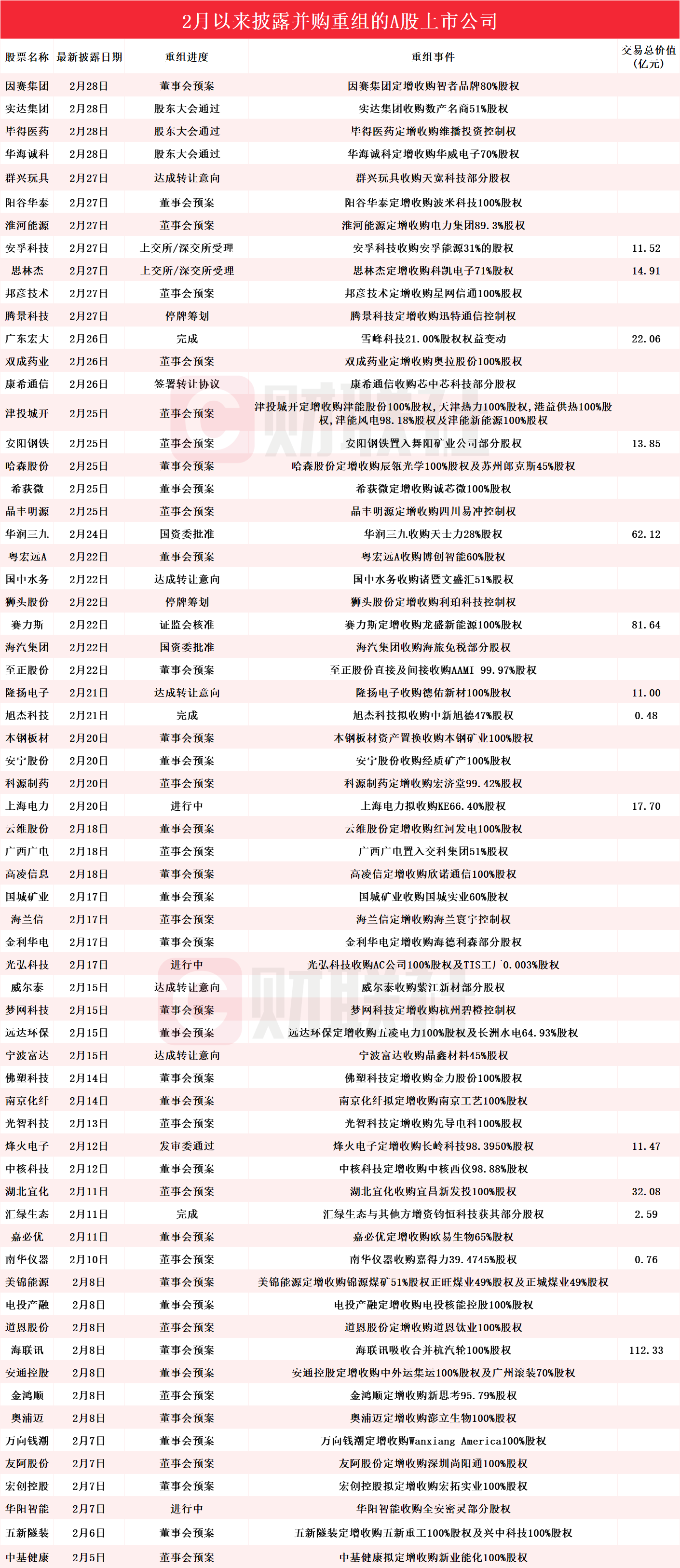 政策东风之下,上市公司并购重组活跃。据Wind数据统计,选取参与角色为竞买方,剔除重组失败,2月以来披露并购重组进展的A股上市公司共有65家,分别为因赛集团、实达集团、毕得医药、华海诚科、群兴玩具、阳谷华泰、淮河能源、安孚科技、思林杰、邦彦技术、腾景科技、广东宏大、双成药业、康希通信、津投城开、安阳钢铁、哈森股份、希荻微、晶丰明源、华润三九、粤宏远A、国中水务、狮头股份、赛力斯、海汽集团、至正股份、隆扬电子、旭杰科技、本钢板材、安宁股份、科源制药、上海电力、云维股份、广西广电、高凌信息、国城矿业、海兰信、金利华电、光弘科技、威尔泰、梦网科技、远达环保、宁波富达、佛塑科技、南京化纤、光智科技、烽火电子、中核科技、湖北宜化、汇绿生态、嘉必优、南华仪器、美锦能源、电投产融、道恩股份、海联讯、安通控股、金鸿顺、奥浦迈、万向钱潮、友阿股份、宏创控股、华阳智能、五新隧装和中基健康。具体情况如下图: