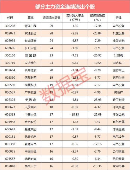青岛中程是连续流出天数最多的个股,已连续29个交易日净流出;其次还有软控股份、长城证券等,主力资金分别连续流出28天、24天。