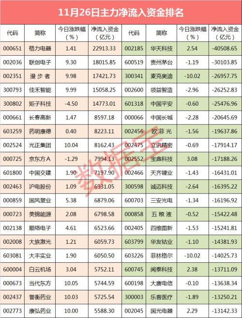 主力资金净流出个股中,华天科技主力净流出资金最多,资金净流出4.05亿元;其次是贵州茅台、麦克奥迪,净流出资金分别为3.01亿元、2.70亿元。